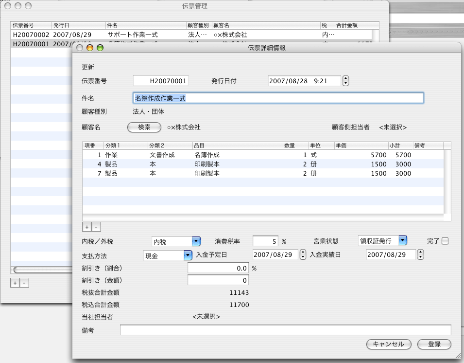 基本は売上伝票で伝票番号が採番され管理されます。この情報から見積書、納品書、請求書、領収証などを作成・印刷することが出来ます。また顧客情報や品目情報を結びつけられています。