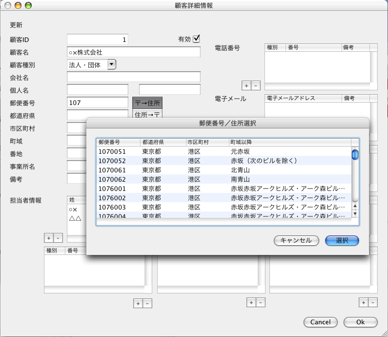 顧客情報の登録は、住所はもちろん先方の担当者に関しても登録できます。また住所登録の際の郵便番号から住所、または住所からの検索も事業所の個別番号も含めてサポートしています。