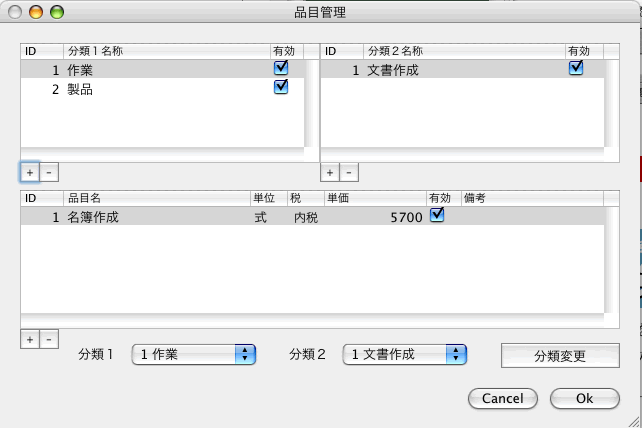 品目情報は分類1、分類2の2段階で分けています。また販売を中止したり、後継の品目ができたような場合には従来の品目の有効チェックを外して選択候補に挙げないこともできます。